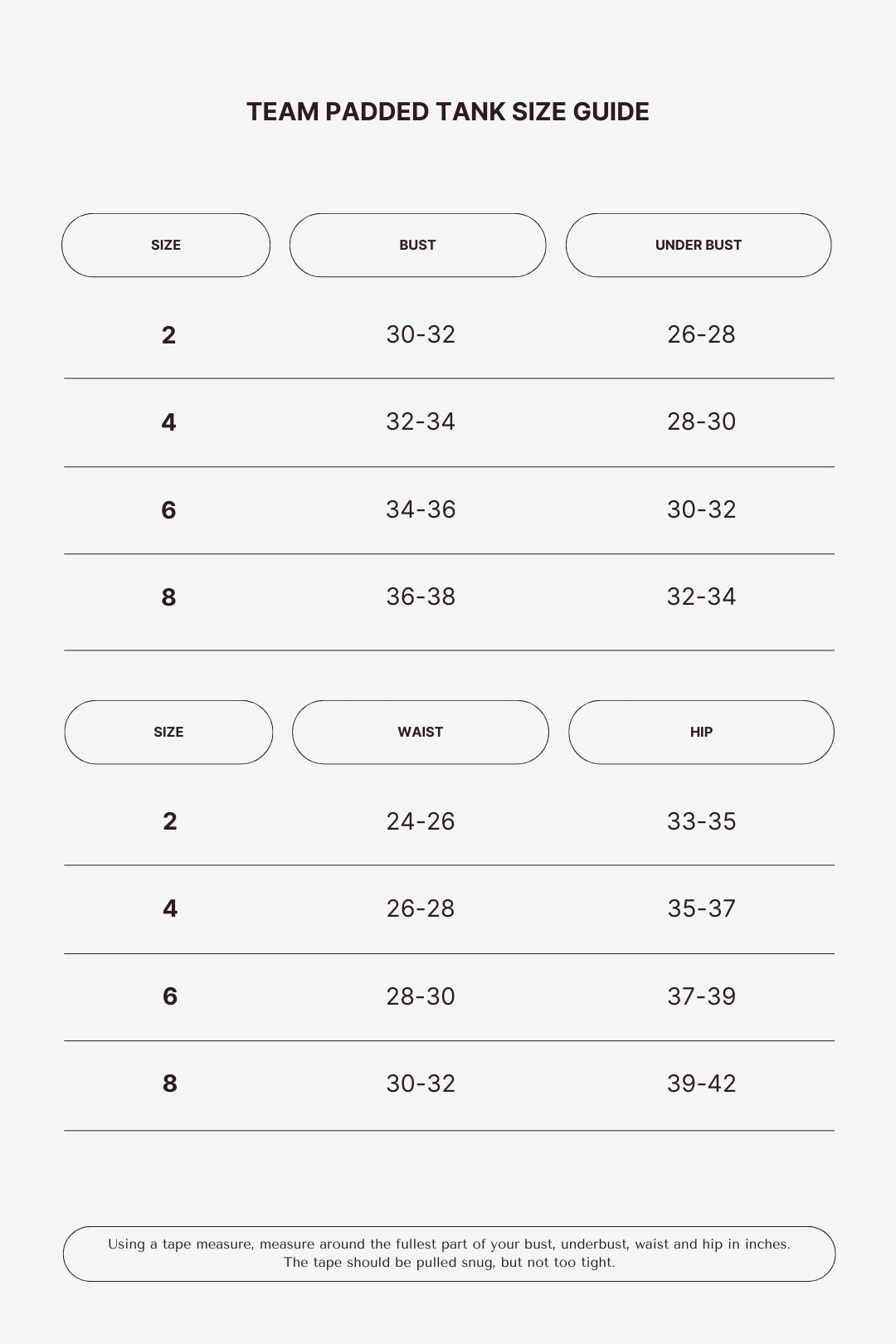We’ve broken it down by category to make it simple. Use the chart below (in inches) and measure your bust, waist, hips, and under-bust.If you’re between sizes, sizing up usually gives a more relaxed fit.Note: If a product page shows a different sizing table, follow that one—it’s tailored specifically for that item.Women - Tops